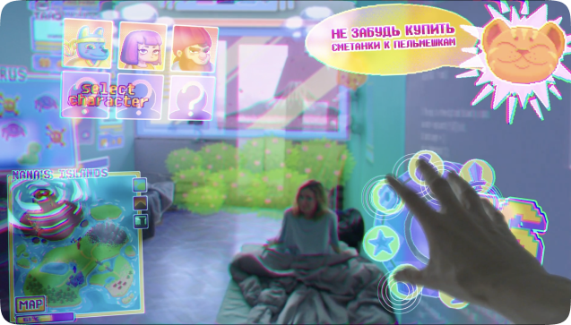 Для оформления виртуальной комнаты главного героя мы разработали интерфейс в стиле pixel art. Этот выбор не случаен — стиль пиксельного искусства добавляет фильму особую атмосферу, напоминающую классические видеоигры 90-х годов, что создает контраст с высокотехнологичной AR-средой. Каждый элемент интерфейса, от виджетов до кнопок, был проработан с нуля, чтобы сочетать простоту, узнаваемость и функциональность. Наша команда постаралась сделать так, чтобы каждый элемент вызывал у зрителя чувство ностальгии и легкости.