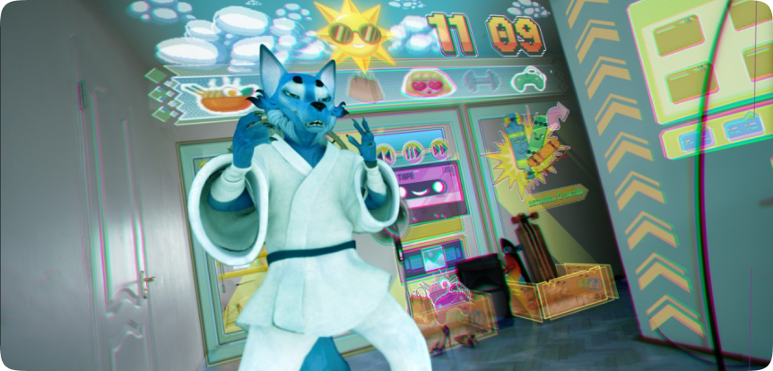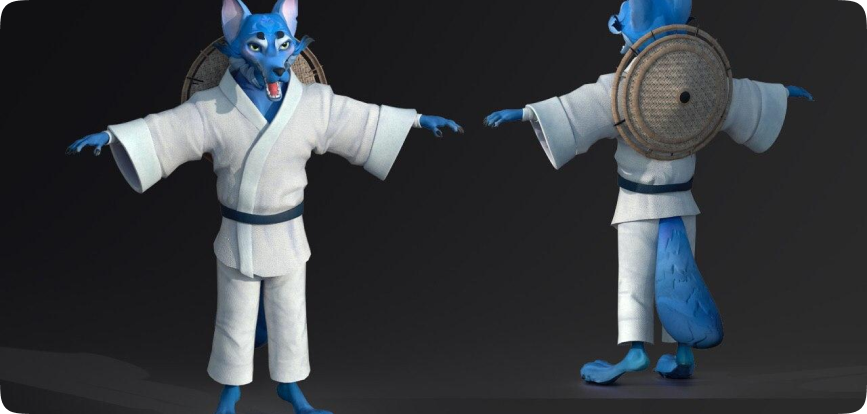 Аватар главного героя — это не просто цифровой персонаж, а его виртуальное отражение, созданное нами с учетом характера и предпочтений героя. Мы разработали образ волка в кимоно, который подчеркивает его увлечение восточными единоборствами. Волк символизирует силу, мудрость и справедливость, но в то же время обладает дерзким характером, что делает его уникальным и запоминающимся. Наша команда постаралась передать эти качества через каждую деталь: от текстуры меха до проработки движений, чтобы персонаж выглядел живым и эмоционально насыщенным."